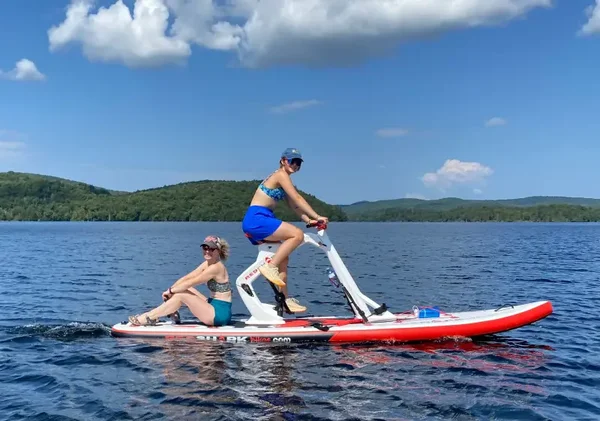 The Red Shark Enjoy Surf Bike is our most sold model and is designed for everyone to enjoy the bike riding experience on rivers, lakes and seas. The Enjoy provides a high degree of stability and maneuverability pedaling forward or reverse with a 1:10 ratio gearbox, two interchangeable propellers and adjustable stable-rudder system for turning and anti-roll stabilization. The Enjoy is built on an inner-core fiber reinforced inflatable board that will glide over varying water conditions with ease and only uses the highest quality aluminum and stainless steel hardware for years of maintenance free use in all weather conditions requiring only a wash down after each use.